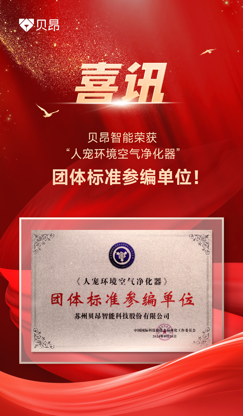 自成立以来,贝昂智能始终专注于研发与创新,致力于为用户提供更清洁安全、健康的室内空气解决方案。这次成功参选为“人宠环境空气净化器”团体标准的参编单位,是对贝昂智能持续创新和品质追求的高度认可,贝昂智能将积极参与标准的制定与修订工作,推动行业技术进步和标准化发展。