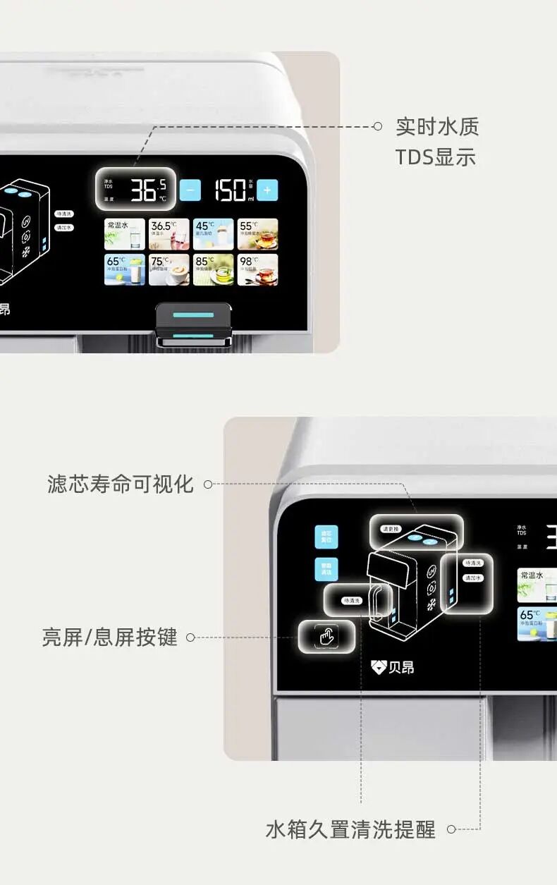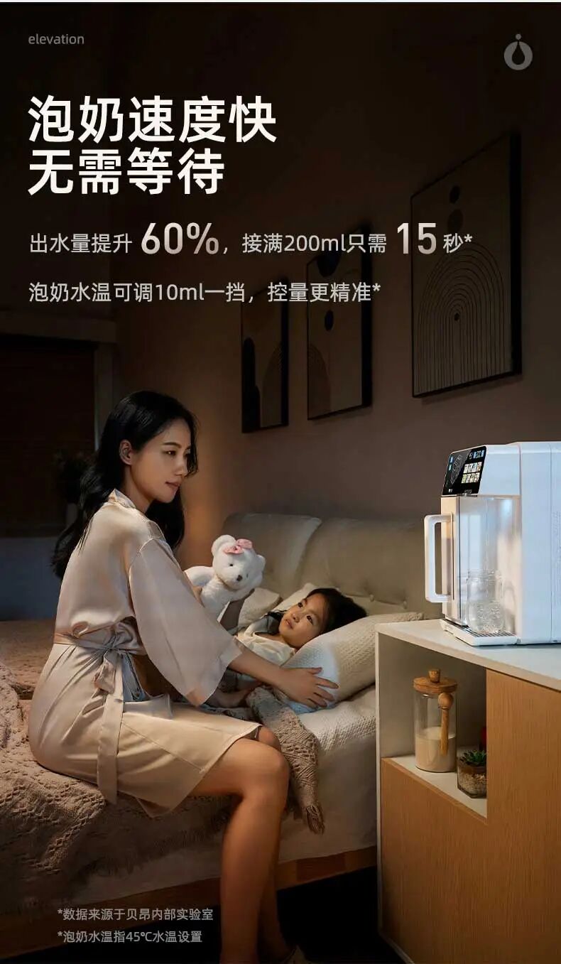 贝昂 R200 净水器设有8档水温模式,泡奶、泡茶、泡咖啡,满足全家人的用水需求。在45°泡奶模式下,出水量精准控制在10ml 出水一次,使泡奶更加方便,再也不用为精确泡奶反复操作啦~