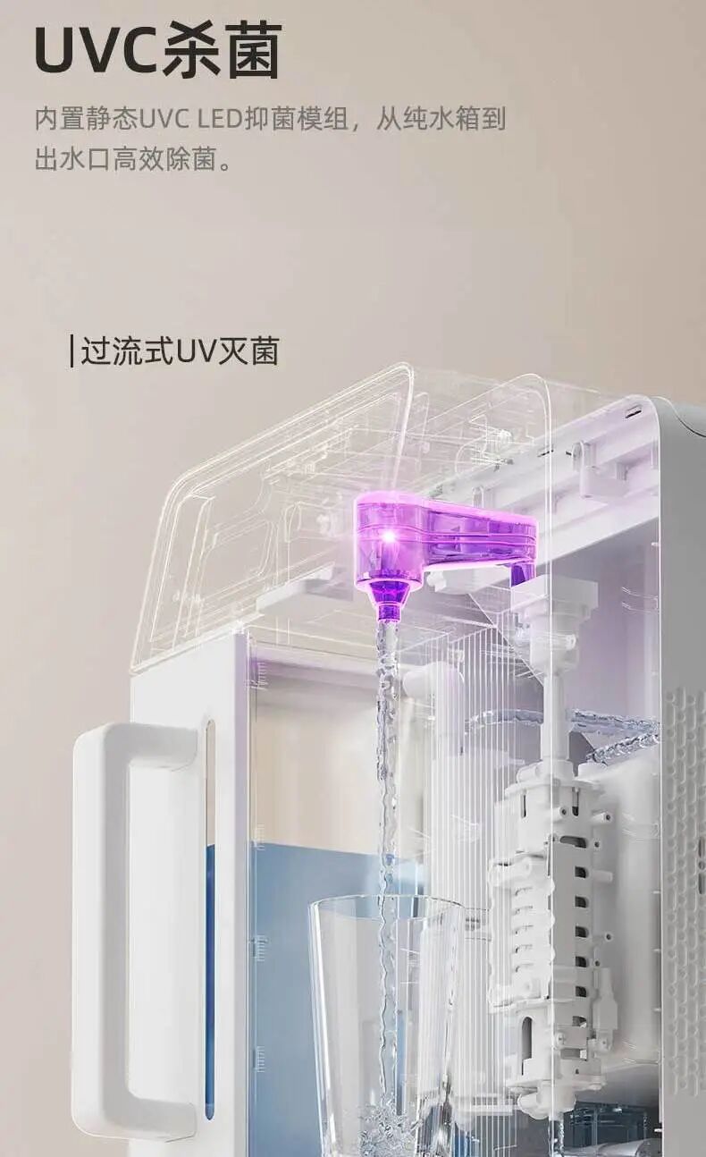 在做到 0 陈水的同时,贝昂 R200 净水器还在出水口处搭载了UVC灭菌模组,对出水口物理灭菌,来预防因日常使用中误触造成的出水口污染,由里到外,全效灭菌!