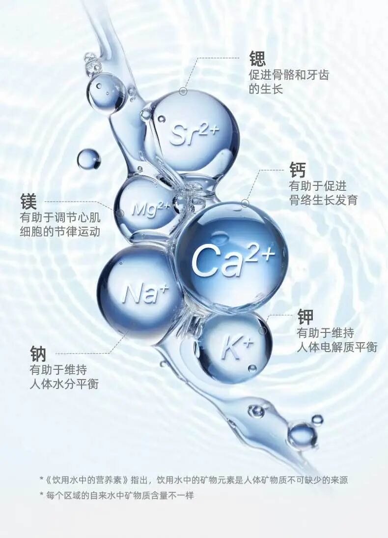 贝昂 R200 净水器通过革新ROC滤芯和微量矿物质元素配比,为纯水注入均衡的 锶、钙、镁、钠、钾 五种对人体有益的天然矿物质,使口感清冽的同时更能促进宝宝骨骼发育和健康成长。