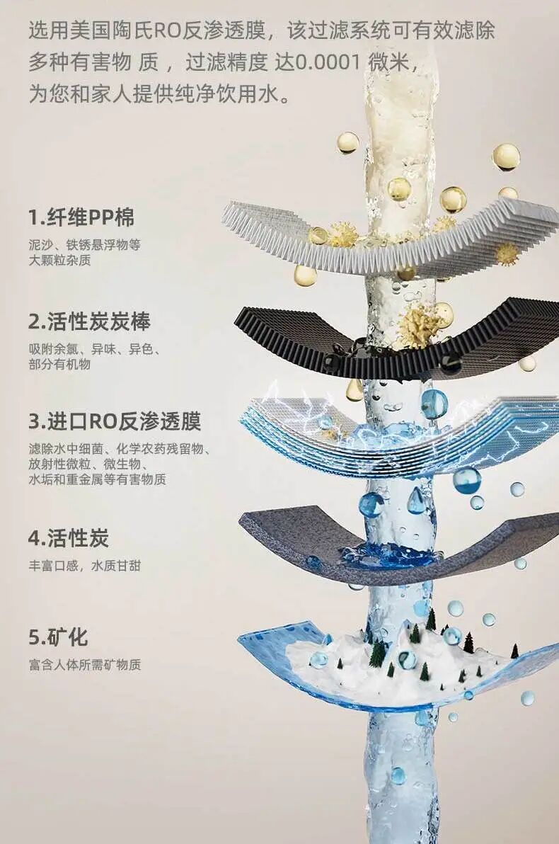 净水直饮,最重要的当然是“净”。贝昂 R200 选用美国陶氏RO反渗透膜,该过滤系统可有效滤除多种有害物质 ,过滤精度达0.0001 微米,为您和家人提供纯净饮用水。